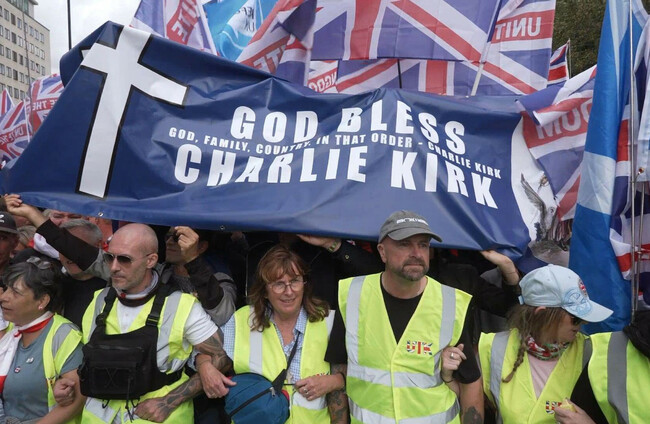 People hold a banner in memory of Charlie Kirk during the Tommy Robinson-led Unite the Kingdom march and rally in central London.