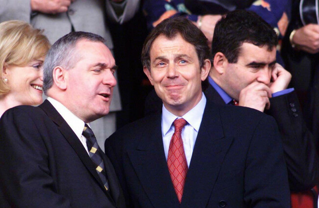 Tony Blair (right) and Bertie Ahern (left) attend the FA Cup Finall in 1999. Alamy Stock Photo