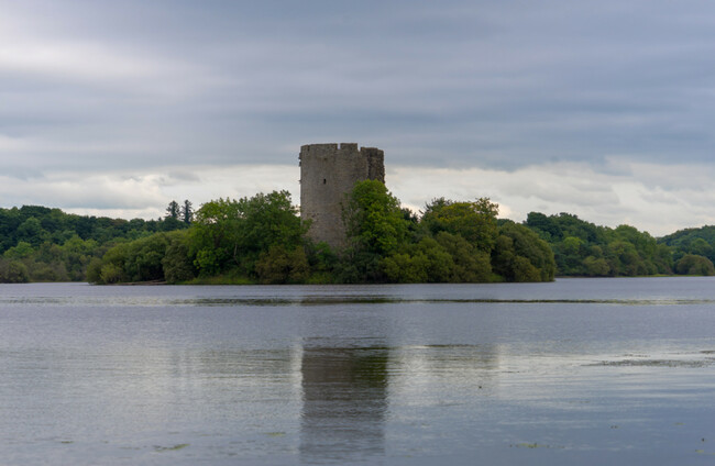 This standalone castle ruin and round tower is located in the natural landscape of the Lough Oughter network of waterways.