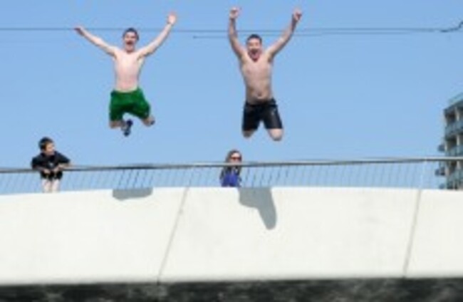 Michael Spain and Joseph McCarthy jump into the Liffey in Dublin's city centre on Wednesday as temperatures rose to 19 degrees Lauren Hutton/Photocall Ireland
