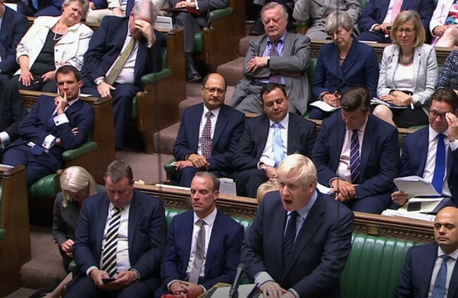 Former prime minister Theresa May (back row third right) looks on as Prime Minister Boris Johnson makes a statement on the G7. UK Parliament