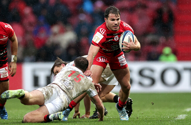Antoine Dupont in action against Stewart Moore. Laszlo Geczo/INPHO