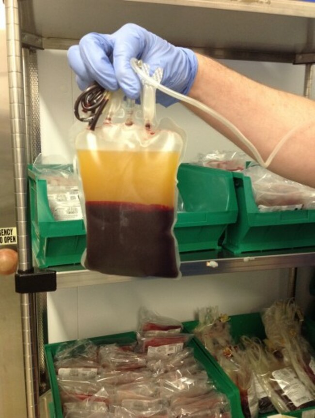 Holding up different packs of plasma, they range from a light yellow to a darkish brown. You forget that you are looking at stuff that has come out of another persons’ body.