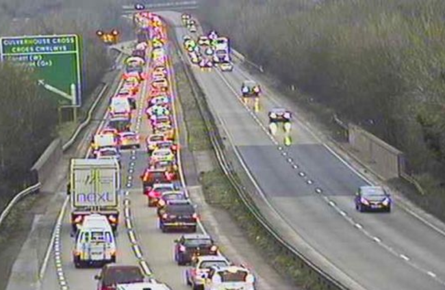 One woman received minor injuries in the crash, which has caused hour-long delays and delayed traffic on the M4 motorway.