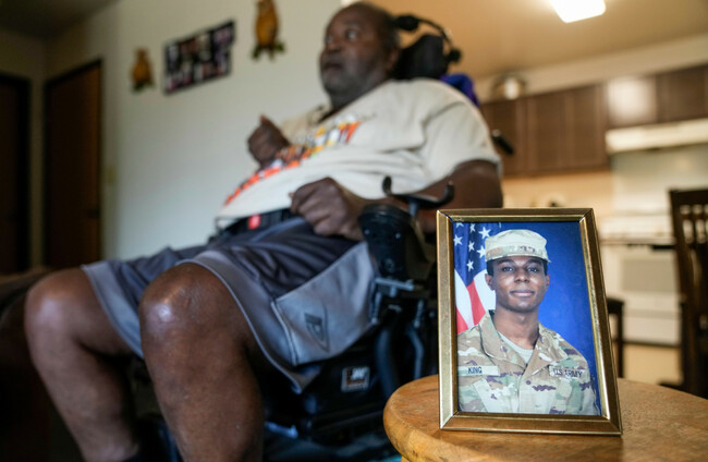 A portrait of American soldier Travis King is displayed as his grandfather, Carl Gates, talks about his grandson.