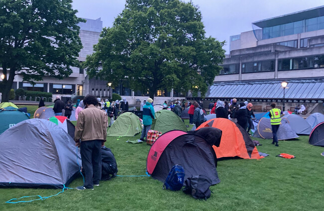 Roughly seventy students are continuing to take part in the protest, and tents have been pitched on the college grounds. Meanwhile, benches have been stacked to block the entrance to the Book of Kells Experience.