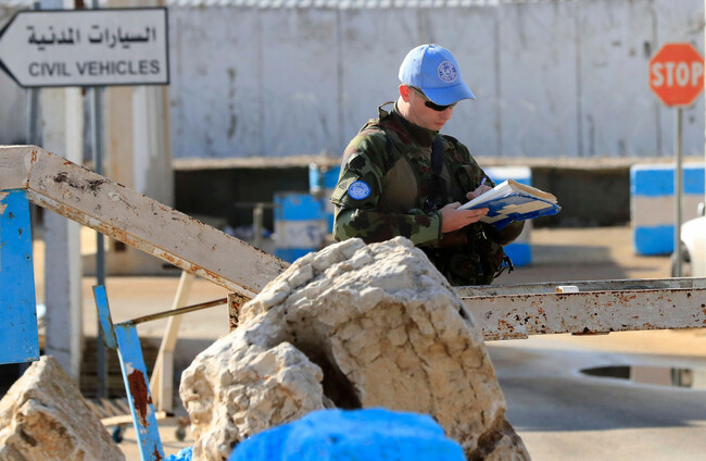An Irish UN soldier at entrance of the Irish UN peacekeepers base, in Tireh village, south Lebanon Alamy