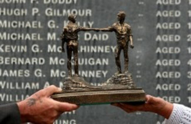Relatives of the victims of Bloody Sunday hold a statue presented to them by leaders of Northern Ireland's protestant churches. Julien Behal/PA Wire