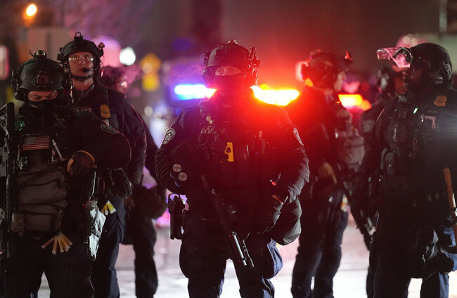 Law enforcement prepare to make arrests after declaring an unlawful assembly during a noise demonstration outside the Graduate by Hilton Minneapolis hotel on Wednesday. Alamy Stock Photo