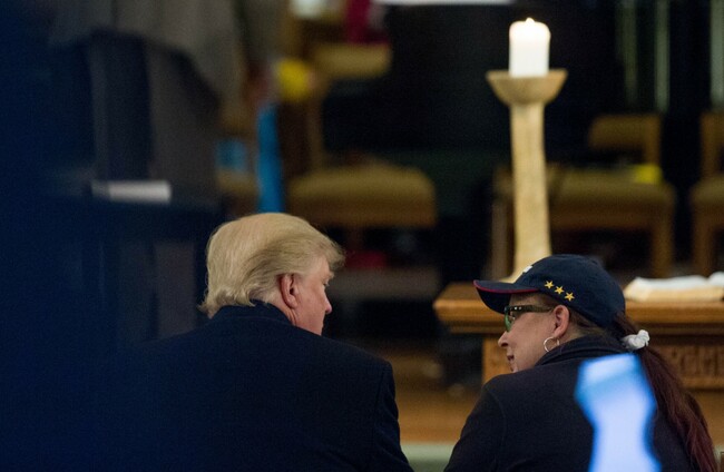 At one point, Trump shared a prayer book with Debra Whitaker, an Iowa supporter seated to his right. She put her hand gently around Trump’s waist as the congregation sang Hymn 409 – God is Here! Trump could be seen by some mouthing the words of the hymn.