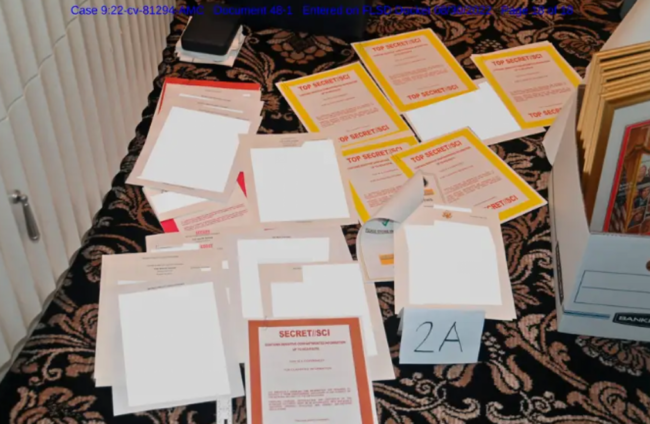 Strikingly, the filing included a photograph of color-coded documents spread out over a carpet, marked “SECRET” and “TOP SECRET.”