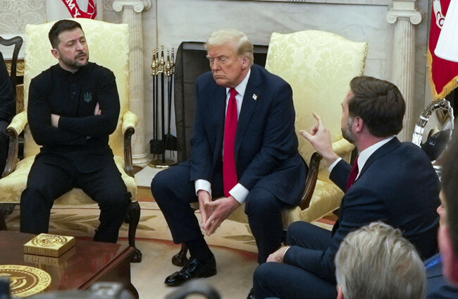 Vice President JD Vance, right, speaks with Ukrainian President Volodymyr Zelenskyy, as President Donald Trump listens in the Oval Office at the White House. Alamy Stock Photo