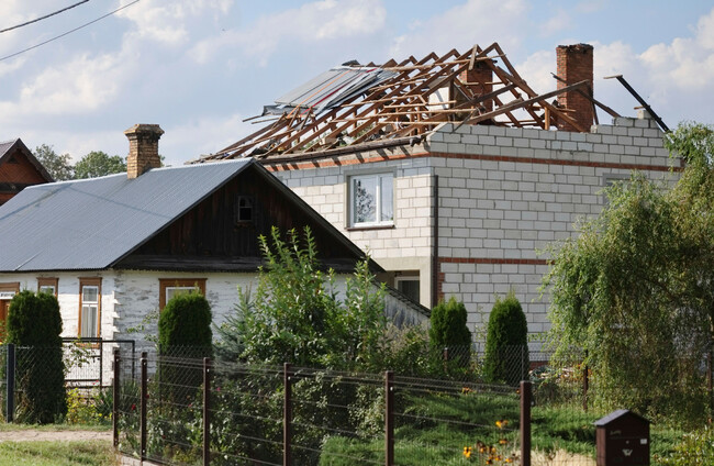 A destroyed roof of a house, after Russian drones violated Polish airspace during an attack on Ukraine. Alamy Stock Photo