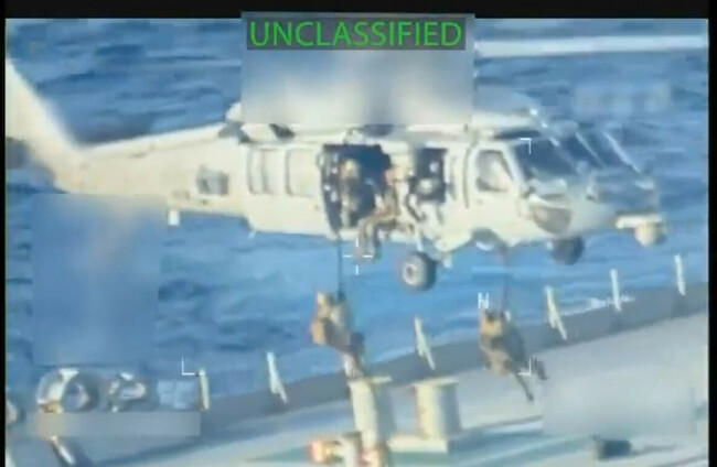 Video published by US Attorney General Pam Bondi showing troops rappelling from a helicopter onto the tanker's deck