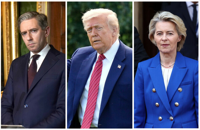 L-R: Foreign Affairs Minister Simon Harris, US President Donald Trump, President of the European Commission Ursula von der Leyen. Alamy