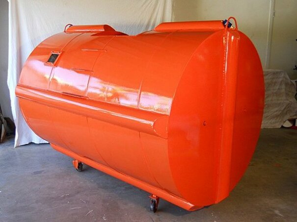 The Tsunami Survival Pod can seat up to four people, and has accommodations for infant and child restraints. Once the watertight doors are shut, the survival craft has enough air inside for approximately two and a half hours with inward-opening access panels to let fresh air in if needed, as well as 1-inch bulletproof glass to allow light into the pod.