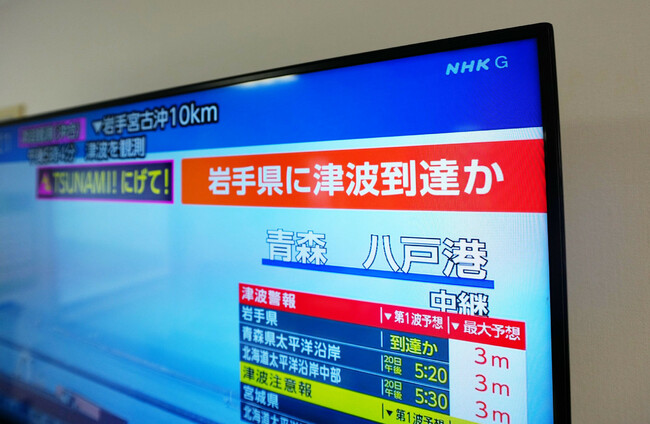 Image shows a television in Japan broadcasting the tsunami warning. Alamy Stock Photo