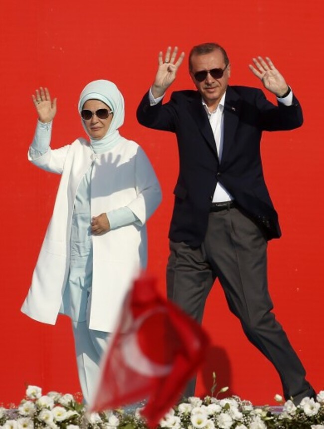 Turkish President Recep Tayyip Erdogan and his wife Emine during an Istanbul rally in August. Emrah Gurel/PA