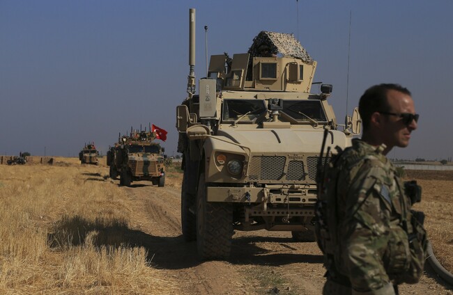 Turkish and American armoured vehicles patrol as they conduct joint ground patrols in the so-called ‘safe zone’ on the Syrian side of the border with Turkey AP