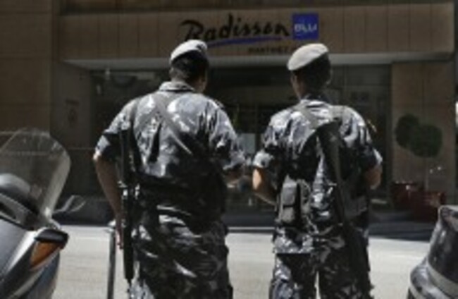 Lebanese policemen stand guard outside a hotel where the rest of the Turkish Airlines crew are staying.