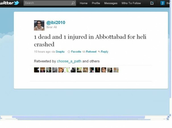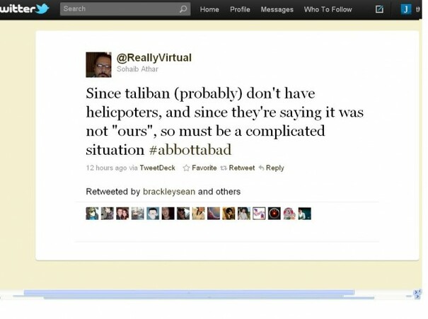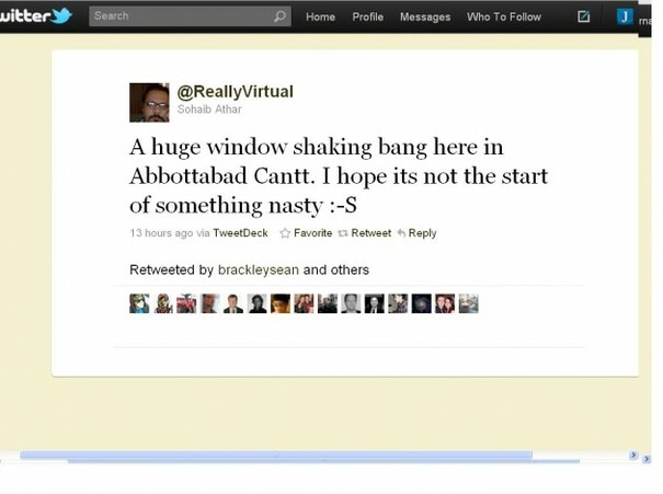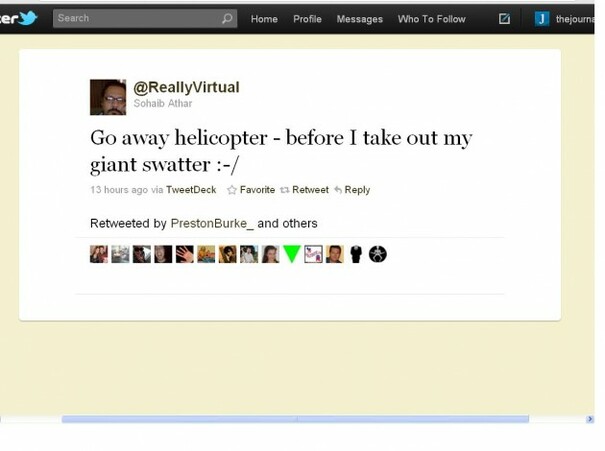 Sohaib Athar, who describes himself on his Twitter profile as “an IT consultant taking a break from the rat-race by hiding in the mountains with his laptops”, began tweeting when he heard a helicopter over his house – a “rare” event in the city, he said.