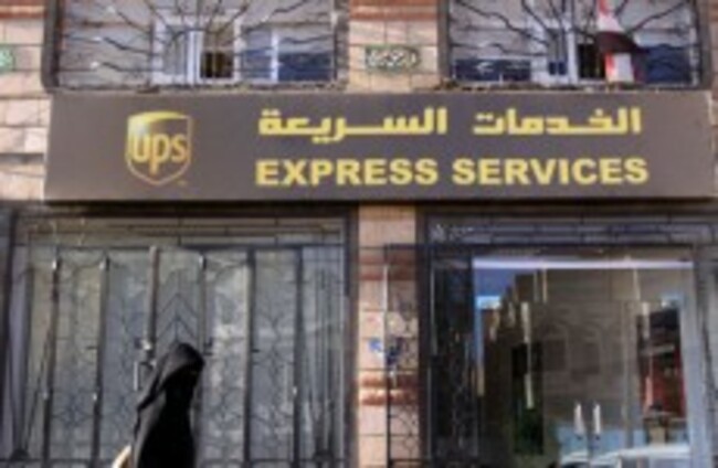 An unidentified Yemeni woman walks past UPS office in Saha'a.