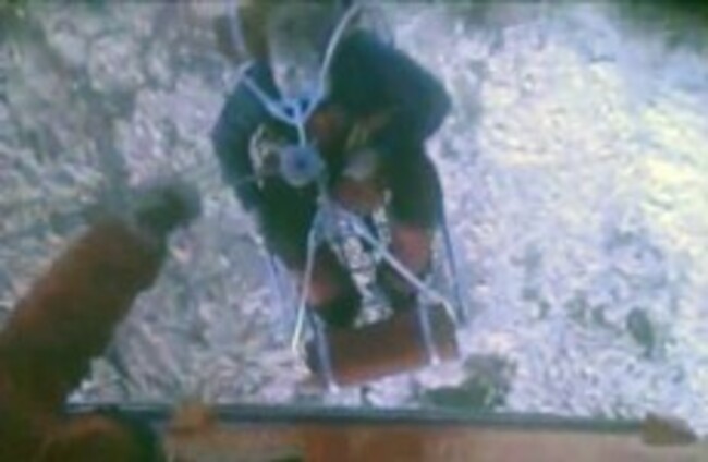 This framegrab image provided by the U.S. Coast Guard shows one of three crew members from the yacht Low Speed Chase being rescued AP Photo/US Coast Guard