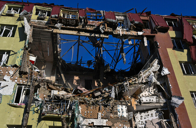 A residential building is seen heavily damaged after a Russian strike in Odesa, Ukraine, today. AP Photo/Michael Shtekel