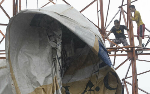 Workers bring down a giant billboard as strong winds from Typhoon Nesat blow in suburban Quezon City, north of Manila. AP Photo/Aaron Favila