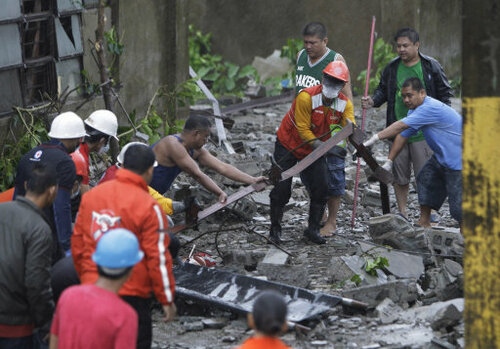 Rescuers remove a piece of metal as they try to recover the bodies of four victims when a concrete wall collapsed. AP Photo/Pat Roque