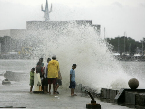 A group of onlookers gather by the seawall as strong waves brought about by the typhoon surge high in Manila. AP Photo/Bullit Marquez