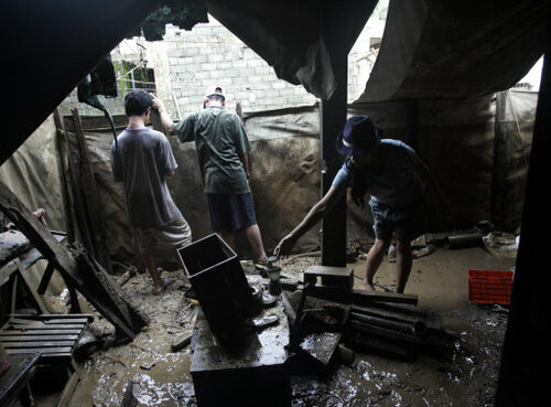 Wilma Pempena right, starts cleaning their house after floodwater receded, as her husband Ronnie and their son repair their house damage. AP Photo/Pat Roque