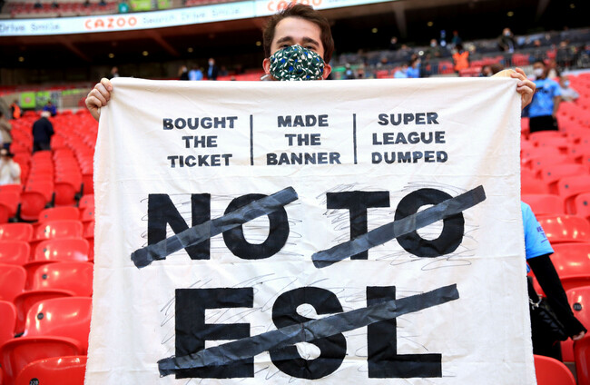 A fan protests against the European Super League. Alamy Stock Photo