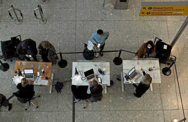 Passengers speak to staff at the entrance to the Covid-19 Testing Centre at London's Heathrow Airport. PA