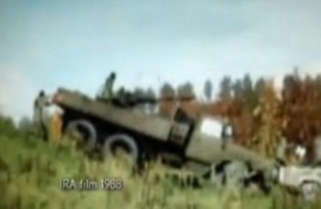 In one sequence – flagged in a screen caption as “IRA film 1988″ – in which a number of men in camouflage uniforms use a heavy machine gun to shoot down a helicopter. A voiceover narrates: “With Gaddafi’s heavy machine guns it was possible to shoot down a helicopter – as the terrorists’ own footage of 1988 shows.”