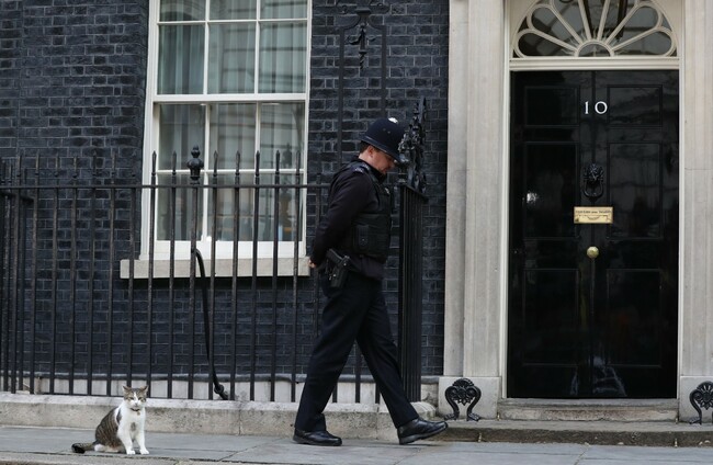 Larry the cat sits outside 10 Downing Street. Jonathan Brady
