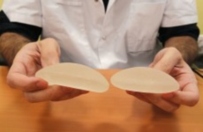 A plastic surgeon hold silicone gel breast implants made by French company PIP, which may be unsafe. AP Photo/Michel Euler