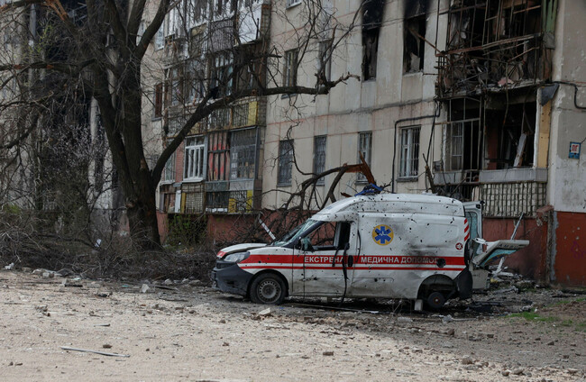 A damaged ambulance hit during a Russian strike in Luhansk region, Ukraine. Alamy Stock Photo