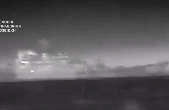 A still from footage released by Ukrainian authorities of the strike on a Russian warship Ukraine Defence Intelligence