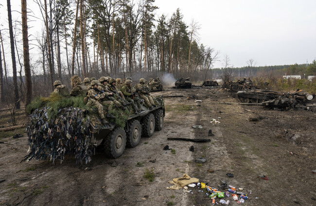 Ukrainian soldiers pass on top of armored vehicles next to destroyed Russian tanks in the outskirts of Kyiv. Photo taken today.