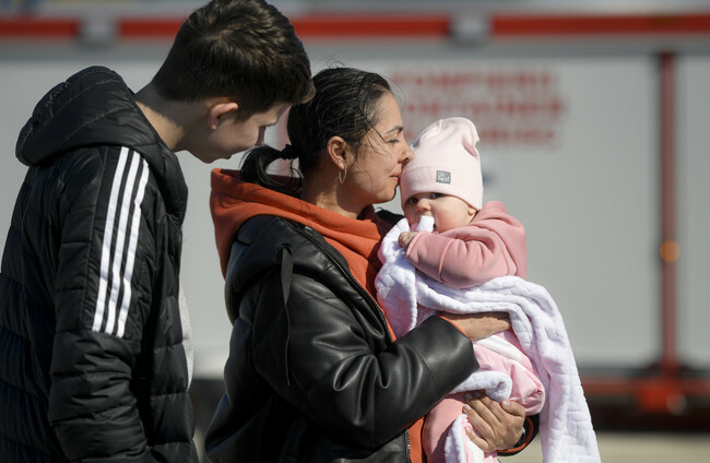 A refugee fleeing the war from neighbouring Ukraine hugging her daughter after crossing the border by ferry at the Isaccea-Orlivka border crossing in Romania today. Andreea Alexandru