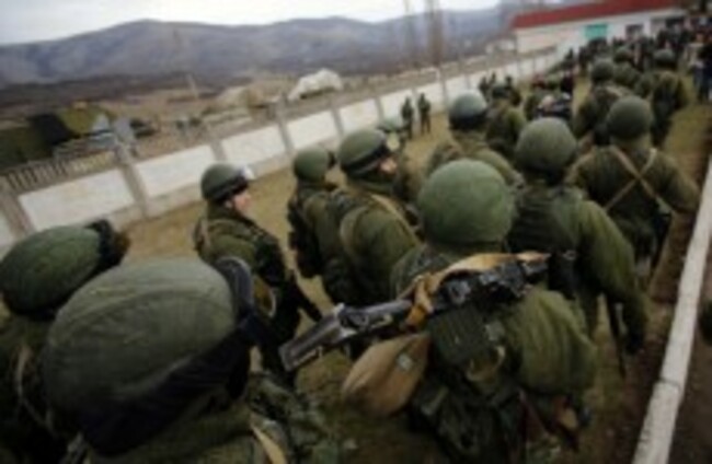Unidentified armed men patrol around a Ukraine infantry base in Perevalne, Ukraine today. Press Association Images