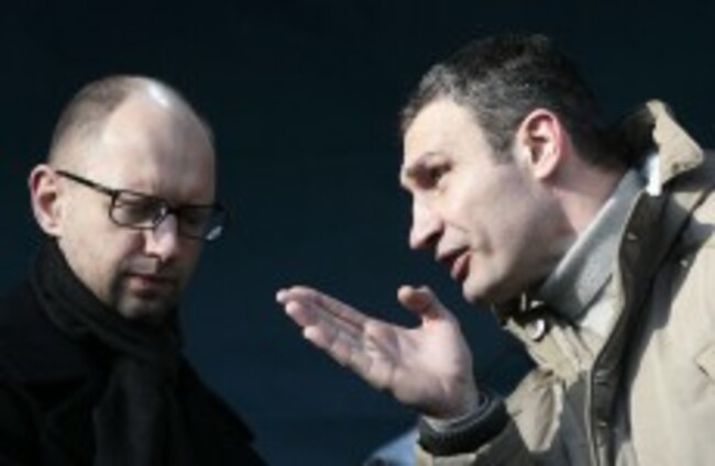 Chairman of the Ukrainian opposition party Udar (Punch), Vitali Klitschko, speaks to opposition leader Arseniy Yatsenyuk. Sergei Chuzavkov/AP/Press Association Images