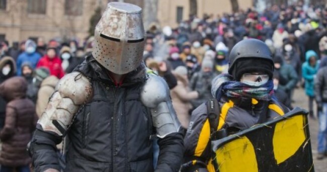 Protesters clad in improvised protective gear prepare for a clash with police in central Kiev. Evgeny Feldman/PA Wire