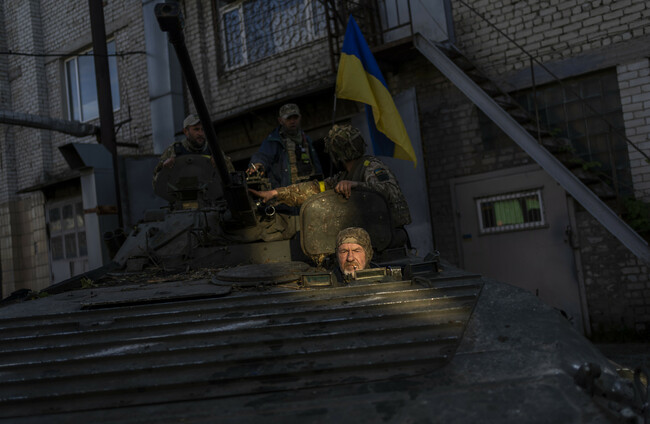 Ukrainian servicemen park a Russian BMP-2, an infantry combat vehicle, in the Kharkiv area. Bernat Armangue/PA