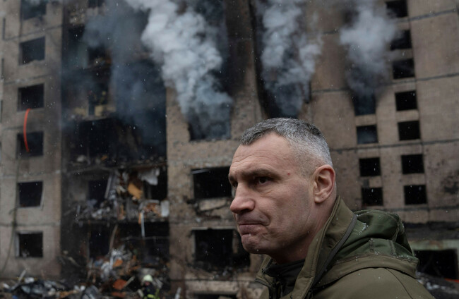 Mayor of Kyiv Vitali Klitschko inspects damage caused by Tuesday's attacks by Russia. Alamy