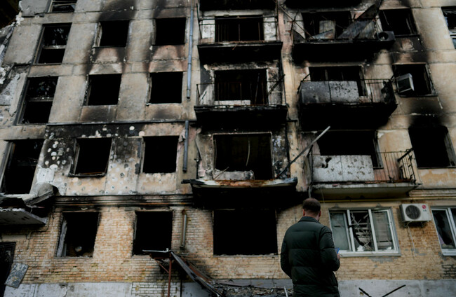 A damaged building ruined by attacks in Hostomel, outskirts Kyiv, Ukraine Natacha Pisarenko/AP