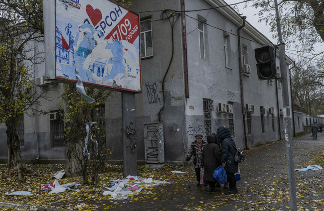 Residents gather below a billboard next to the remains of Russian posters in Kherson. AP/PA Images