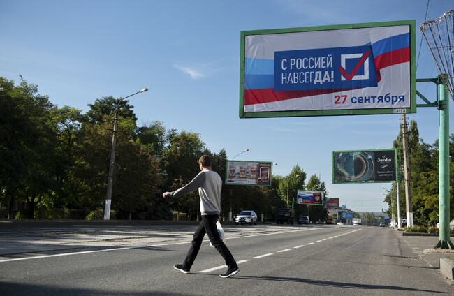 A man crosses the road in front of a billboard reading 'With Russia Forever, September 27' in Luhansk AP/PA Images