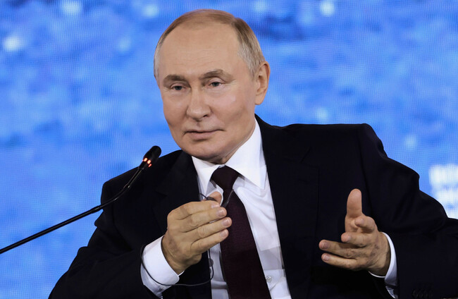 Russian President Vladimir Putin was asked about the Ukraine war during an economic forum Roscongress Foundation via AP